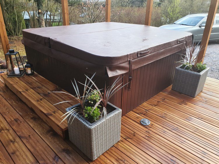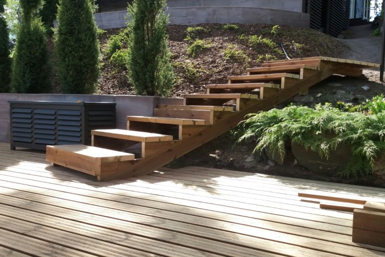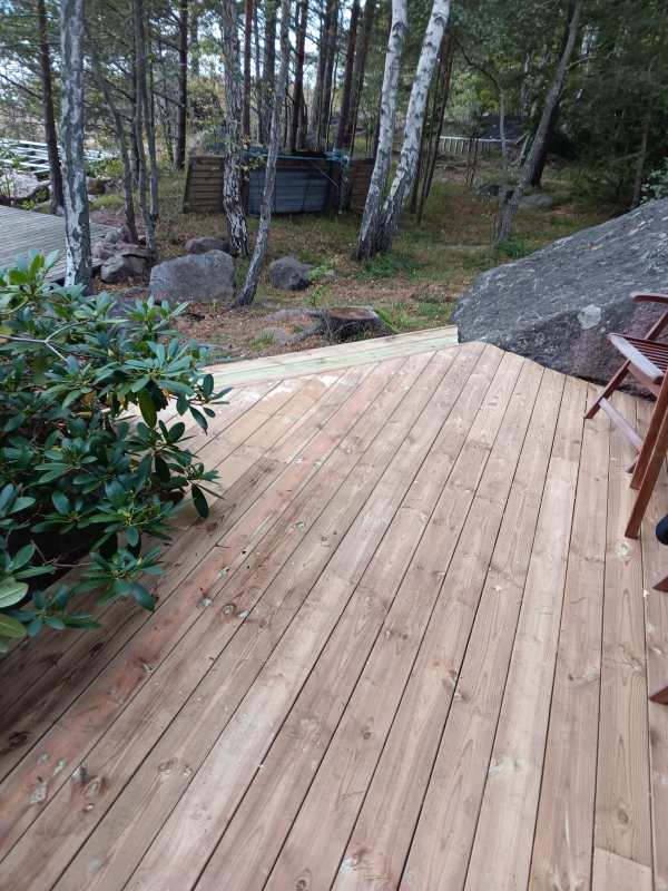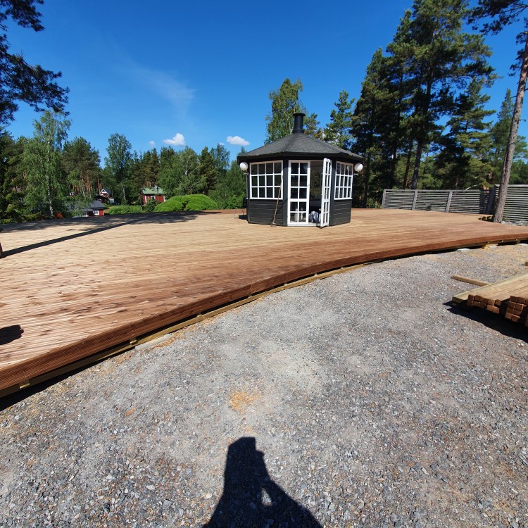 - Aaltomaljakon muotoja jäljittelevä terassi rakennettiin kallion päälle. Kuvasta puuttuu vielä lasikaiteet terassin ympäriltä
